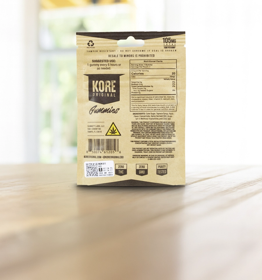 All Kore Original hemp products meet or exceed state and federal compliance standards, including the Florida Department of Agriculture’s requirements for hemp food products. Every batch comes with a scannable QR code linking to a third-party ISO-certified lab report, showing a full cannabinoid breakdown, product lot number, and expiration date. We never use synthetic cannabinoids, and we proudly stand behind every jar with our 100% satisfaction guarantee. Whether you’re buying for yourself or gifting to someone you care about, CBD Natural Gummies are a smarter, cleaner way to enjoy hemp — with all the TLC you expect from Kore Original.